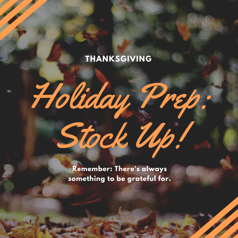 A lot of grocery sales are going on this time of year, and it’s a good idea to stock up on basics to make holiday prep easier. Things like flour, sugar, canned pumpkin, and other pantry staples will keep well until the holidays. You will be less stressed if you have most of your ingredients waiting for you when you’re ready to cook and bake.
